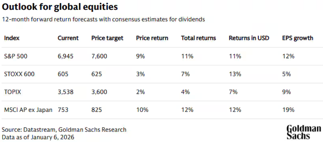 Globální akcie by měly v příštích 12 měsících přinést výnos 11 %. Po silném růstu v loňském roce budou globální akcie pravděpodobně pokračovat v růstu i v roce 2026, protože Goldman Sachs Research předpovídá 11% výnosy v příštích 12 měsících (včetně dividend, v amerických dolarech). Akcie by měly být podporovány zisky a ekonomickým růstem po celém světě, i když loňský růst vedl k historicky vysokým oceněním. Investoři, kteří v loňském roce diverzifikovali své investice napříč regiony (takové je i naše doporučení), z toho měli prospěch. Tento trend může pokračovat. Světová ekonomika je připravena na pokračující expanzi ve všech regionech v roce 2026 a americký Federální rezervní systém by měl podle prognóz přistoupit k dalšímu mírnému uvolnění měnové politiky. Vzhledem k tomuto makroekonomickému pozadí by bylo neobvyklé, kdyby došlo k významnému poklesu akcií/medvědímu trhu bez recese, a to i při zvýšených oceněních akcií. Na obrázku níže vidíte predikovaný výnos ostatních trhů v příštích 12 měsících dle Goldman Sachs.