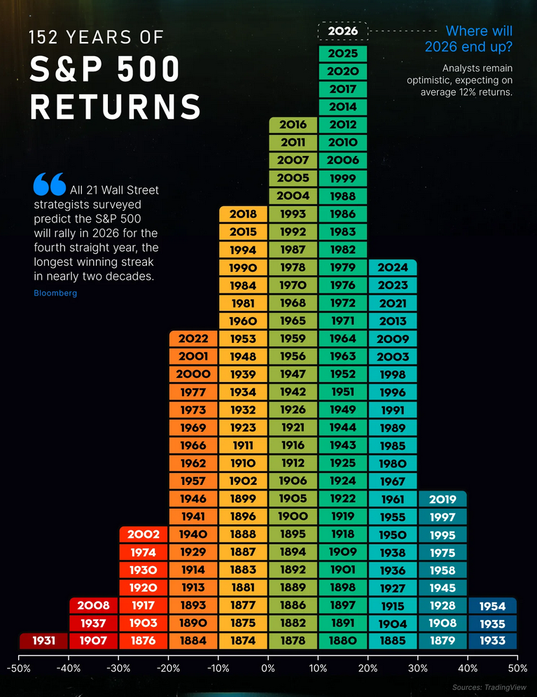 Za posledních 152 let zaznamenal index amerických akcií S&P 500 široké spektrum ročních výnosů, od katastrofálních propadů, jako byl pokles o 44 % v roce 1931, až po masivní růsty, jako byl nárůst o 45 % v roce 1954. Obrázek níže znázorňuje výkonnost indexu S&P 500 za každý kalendářní rok od roku 1871. Index S&P 500 skončil v kladných číslech v téměř 75 % roků od roku 1871, přičemž nejčastější rozmezí se pohybovalo mezi 10 % a 20 %. Rok 2026 by mohl být čtvrtým rokem v řadě, kdy by index zaznamenal zisky, což je v historii indexu S&P 500 velmi vzácné.