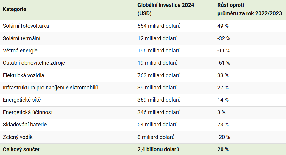 Globální investice do energetické transformace dosáhly v roce 2024 rekordní výše 2,4 bilionu dolarů, což představuje nárůst o 20 % oproti průměrné úrovni výdajů v letech 2022–2023 (tabulka níže). Například investice do elektromobilů vzrostly o 33 % na 763 miliard dolarů, zatímco investice do solární energie vzrostly o 49 % oproti předchozímu referenčnímu období. Celkově byly elektromobily a solární energie dvěma největšími kategoriemi, které v roce 2024 tvořily 55 % celkového objemu. Nejrychleji rostoucím segmentem byly investice do akumulátorových úložišť, které vzrostly o 73 %.