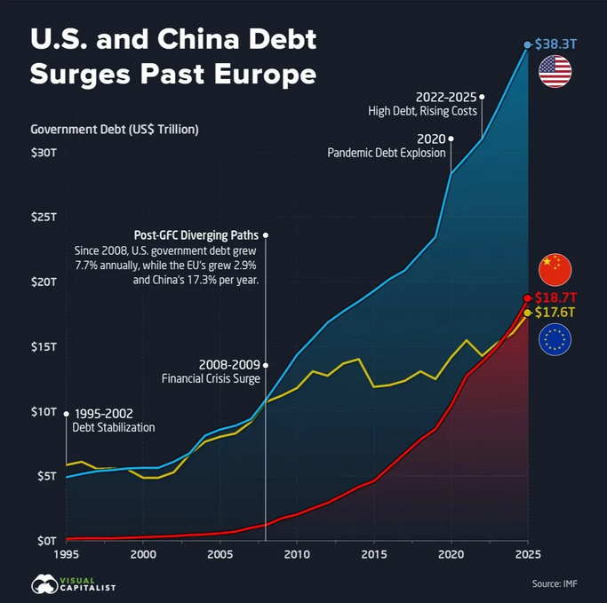To, že jsou státy napříč světem poměrně silně zadluženy, je docela známá věc. Často se zmiňuje Evropská unie či USA. Nicméně se zapomíná na Čínu, kde je tempo zadlužování opravdu celkem rychlé. A často je tato totalitní komunistická ekonomika dávána za vzor. Čínský státní dluh poprvé překonal dluh Evropské unie, což představuje významný posun v globální dluhové situaci. Od finanční krize v roce 2008 se Spojené státy, Čína a Evropa ubíraly v oblasti zadlužování velmi odlišnými cestami. Zatímco Evropa udržovala růst dluhu relativně pod kontrolou, Spojené státy i Čína svůj dluh rychle navyšovaly – zejména po roce 2020. Graf níže znázorňuje celkovou výši ročního státního dluhu USA, EU a Číny v letech 1995 až 2025 v aktuálních amerických dolarech (bez zohlednění inflace) na základě údajů MMF. V roce 2025 dosáhl čínský státní dluh 18,7 bilionu dolarů a poprvé tak překonal celkovou výši dluhu EU, která činila 17,6 bilionu dolarů. Od roku 2008 rostl čínský dluh více než dvakrát rychleji než dluh USA a mnohem rychleji než dluh Evropy. Opravdu je EU tak neakceschopná, jak nám někteří podsouvají?