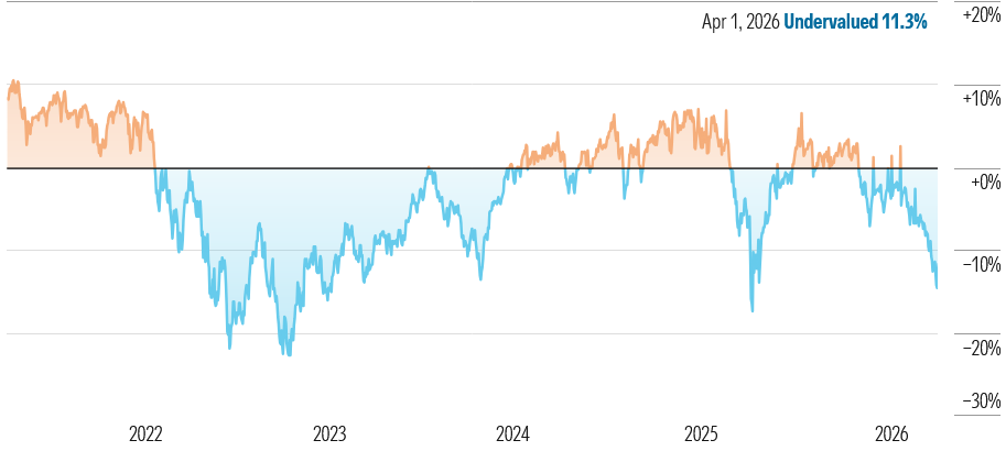 V březnu americké akcie, stejně jako jiné akciové trhy, ve světě klesaly. Je to samozřejmě důsledek ozbrojeného konfliktu na Blízkém východě. Kromě energetického sektoru panují obavy především z nejistoty. Trhy nemají rády nepředvídatelnost a vzhledem k proměnlivé povaze konfliktu s Íránem, spojené s rizikem eskalace, je předpovídání vývoje obzvláště obtížné. Investoři pozorně sledují známky stabilizace, ať už prostřednictvím diplomacie, nebo zlepšení bezpečnosti klíčové infrastruktury. Do té doby budou trhy pravděpodobně citlivé na zprávy, které souvisejí s narušením dodávek energie. Kvůli této volatilitě a tím způsobeným poklesům se ocenění amerických akcií na konci měsíce března dle společnosti Morningstar dostalo do pásma, kdy jsou akcie hodnoceny jako podhodnocené.