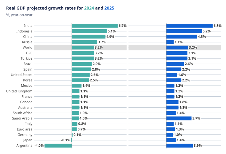 Toto potvrzuje i pohled 38 zemí v rámci uskupení OECD, které zlepšilo výhled růstu světové ekonomiky pro rok 2024 na 3,2 %. Stejný růst je očekáván i pro rok příští. Růst Číny má být tento rok pouze 4,9 % oproti USA 2,6 %. To na první pohled vypadá pro Čínu dobře. S ohledem na minulost je to však zanedbatelný náskok rozvojové ekonomiky oproti vyspělému státu USA.